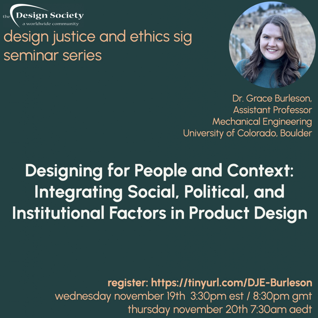 Grace Burleson is a multi-disciplinary researcher working towards advancing design science, with an emphasis on improving engineering for social impact and global development applications. She is an Assistant Professor in Mechanical Engineering and Faculty Fellow in the Mortenson Center in Global Engineering and Resilience at the University of Colorado Boulder, USA. Through experimental and ethnographic human subjects research, her research group seeks to advance engineering design theory and methods so that solutions lead to improved social, environmental, and economic outcomes. Dr. Burleson earned her PhD in Design Science from the University of Michigan, as well as MS in Applied Anthropology and MS/BS in Mechanical Engineering from Oregon State University.