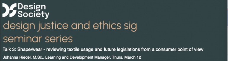 We are delighted to continue the Design Justice and Ethics SIG Seminar Series with a talk from Johanna Riedel who will be facilitating an interactive session, titled “shape/wear - reviewing textile usage and future legislations from a consumer point of view.” The seminar will be on Thursday, March 12th at 9:00am EST/1:00pm GMT. You can register for the seminar here and the abstract for the session is below.